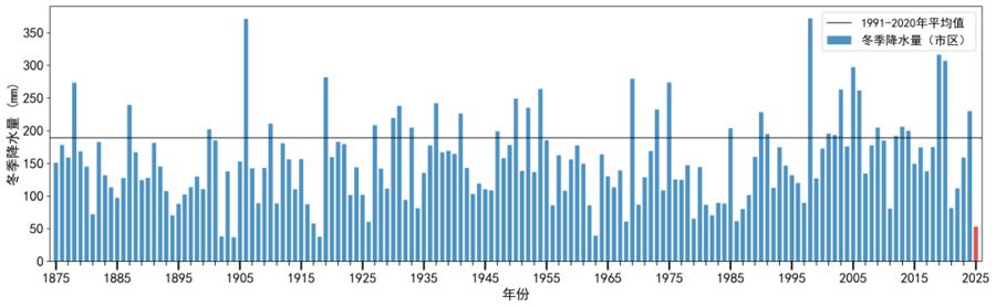 2024年12月-2025年2月,市区总降水量为53.3毫米,仅次于1963年,为自1874年有降水观测记录以来的历史次少。