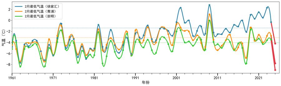 2025年2月8日-9日,本市遭遇强寒潮,全市11个国家基本气象站的日极端最低气温在-4.2℃至-9.0℃之间;其中青浦和崇明两站日极端最低气温分别达-7.8℃和-9.0℃,均打破其1961年建站以来2月极端最低气温纪录。市区日最低气温降至-4.2℃,为1991年以来的2月新低。