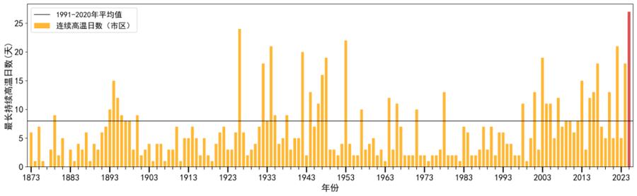 2025年,市区连续高温日数达27天,打破1926年创下的连续24天最长纪录。全年高温日数累计54天,为历史第二高值,仅次于1934年的55天;其中,6月、8月和9月的高温日数分别为9天、27天和8天,均创下各月历史新高。