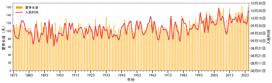 徐家汇站夏季长度(柱状)及入秋时间(折线)