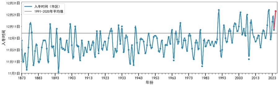 12月以来,冷空气较弱,本市气温持续偏高,直至12月24日才进入气象意义的冬天(连续5天日平均气温低于10℃),为1873年以来历史第二晚(仅早于1991年和2021年的12月25日)。