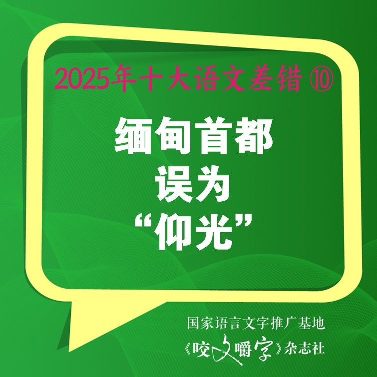 第三,关注语用变化。语文规范具有“时间性”,不同时代有不同时代的语文规范,甚至同一时代的不同时间段规范也有可能有变化。比如,1955年《第一批异体字整理表》发布后曾以“撅嘴”为规范词形,但2013年《通用规范汉字表》发布后写作“噘嘴”才规范。再如,1948年缅甸脱离英联邦独立后定都仰光,但2005年11月已将首都迁往内比都。多年来,编辑部以发展的眼光看待语文规范;在“2025年十大语文差错”评选工作中,同样关注到了语文规范发展变化这一事实。