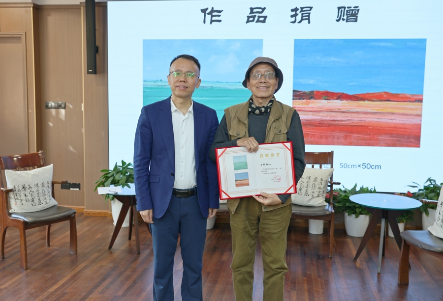 王邦雄,1968年毕业于上海戏剧学院舞台美术系并留校任教,现为上海市文史研究馆馆员,上海戏剧学院教授、博士生导师。他长期致力于中国传统绘画与西方现代绘画的结合,开创独特的绘画语言风格。此次作品展以“觀”为主题,展出油画和剪纸作品共100件,每件展品均与中国文字巧妙结合,既见传统根基,又显时代新意。活动现场,王邦雄向上海市文史研究馆捐赠油画作品《戚》与《苍》。
